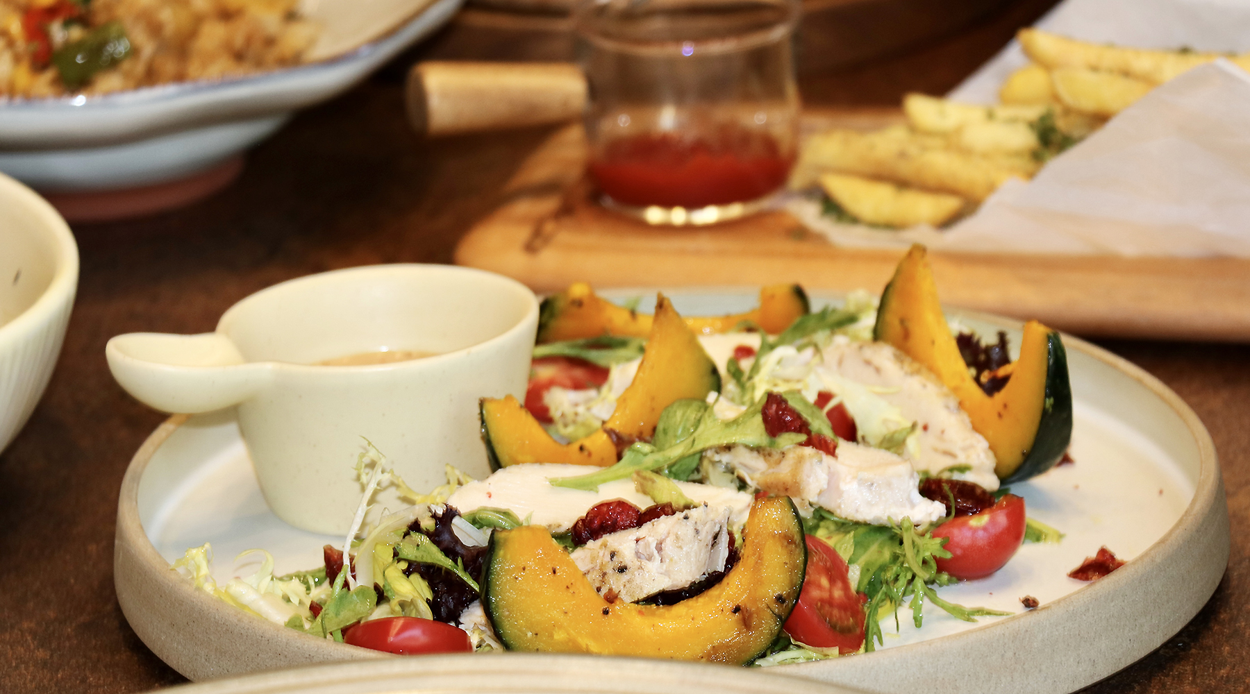 比如烤南瓜块和新鲜生菜、酸甜番茄、醇香芝士混合,再搭上一份风味酱料,软糯酸甜里带着清爽脆嫩,解腻又开胃。这些不厚重的搭配既能平衡秋冬餐食的浓郁,又能凸显南瓜的清新特质,是餐桌上很讨喜的 “轻口味选择”。