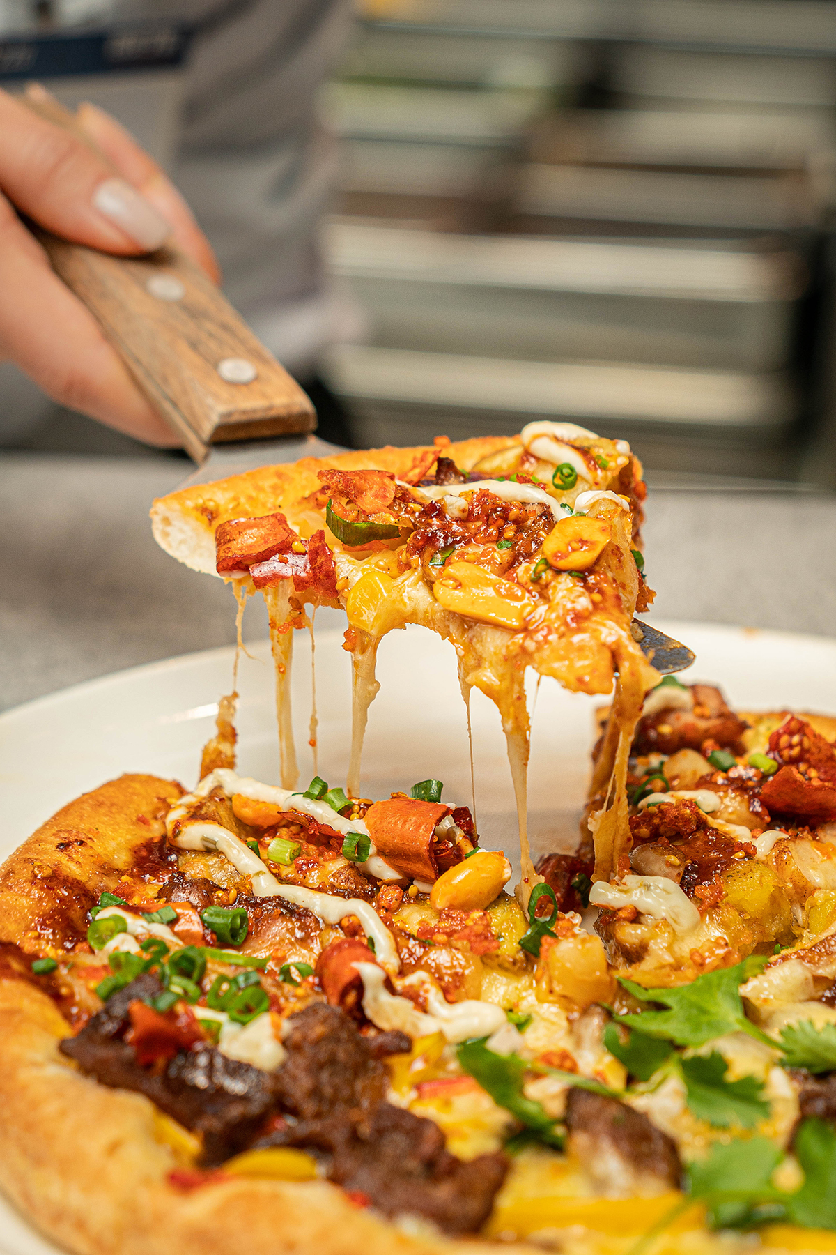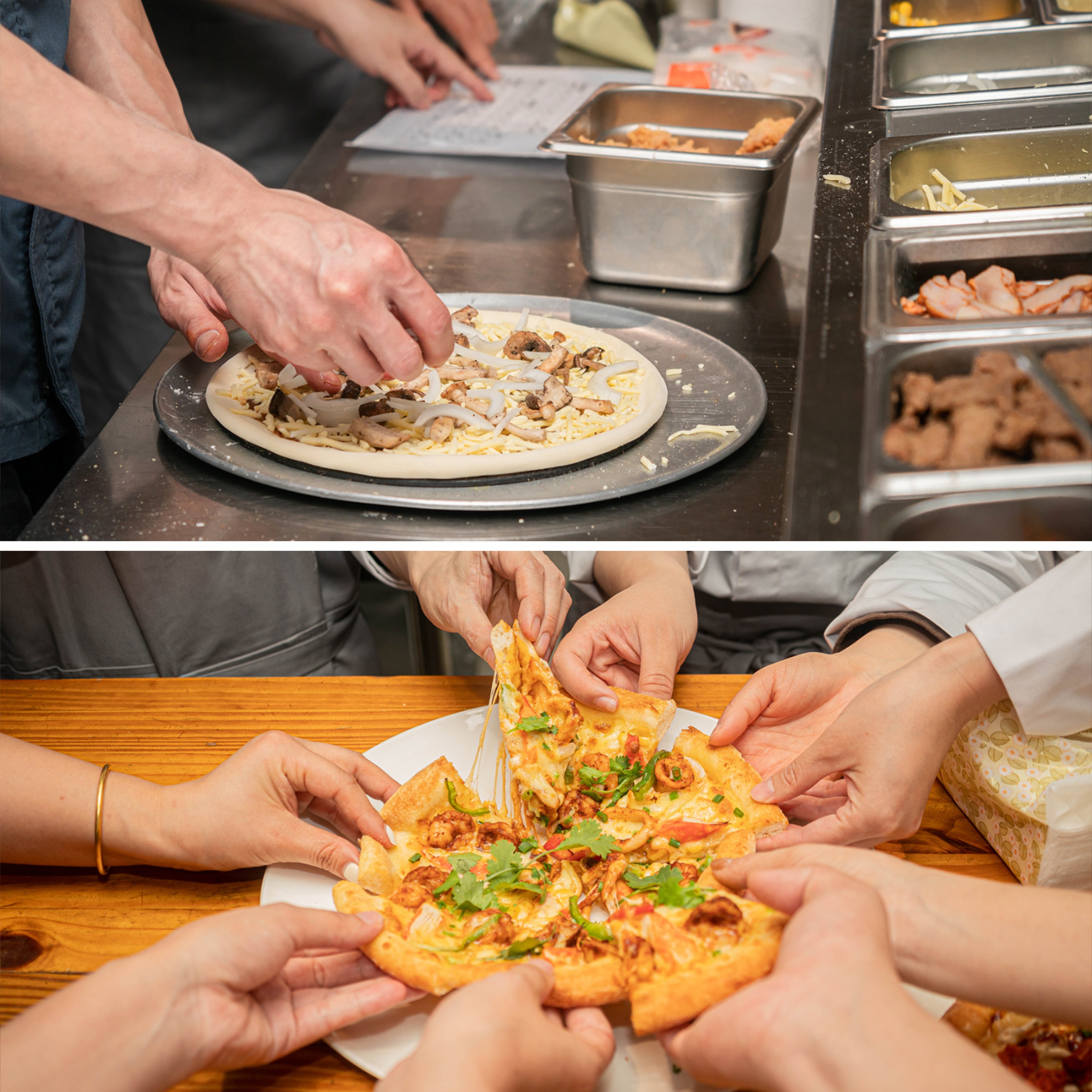 而在出餐上桌时,服务员还可趁热为顾客展示披萨的拉丝动态,用手机记录下来热气升腾的芝士瀑布,把手工结果变成可传播素材。顾客获得的不只是一张手工现烤披萨,更是一张“亲眼见证”的社交货币,美味与分享感双双拉满。