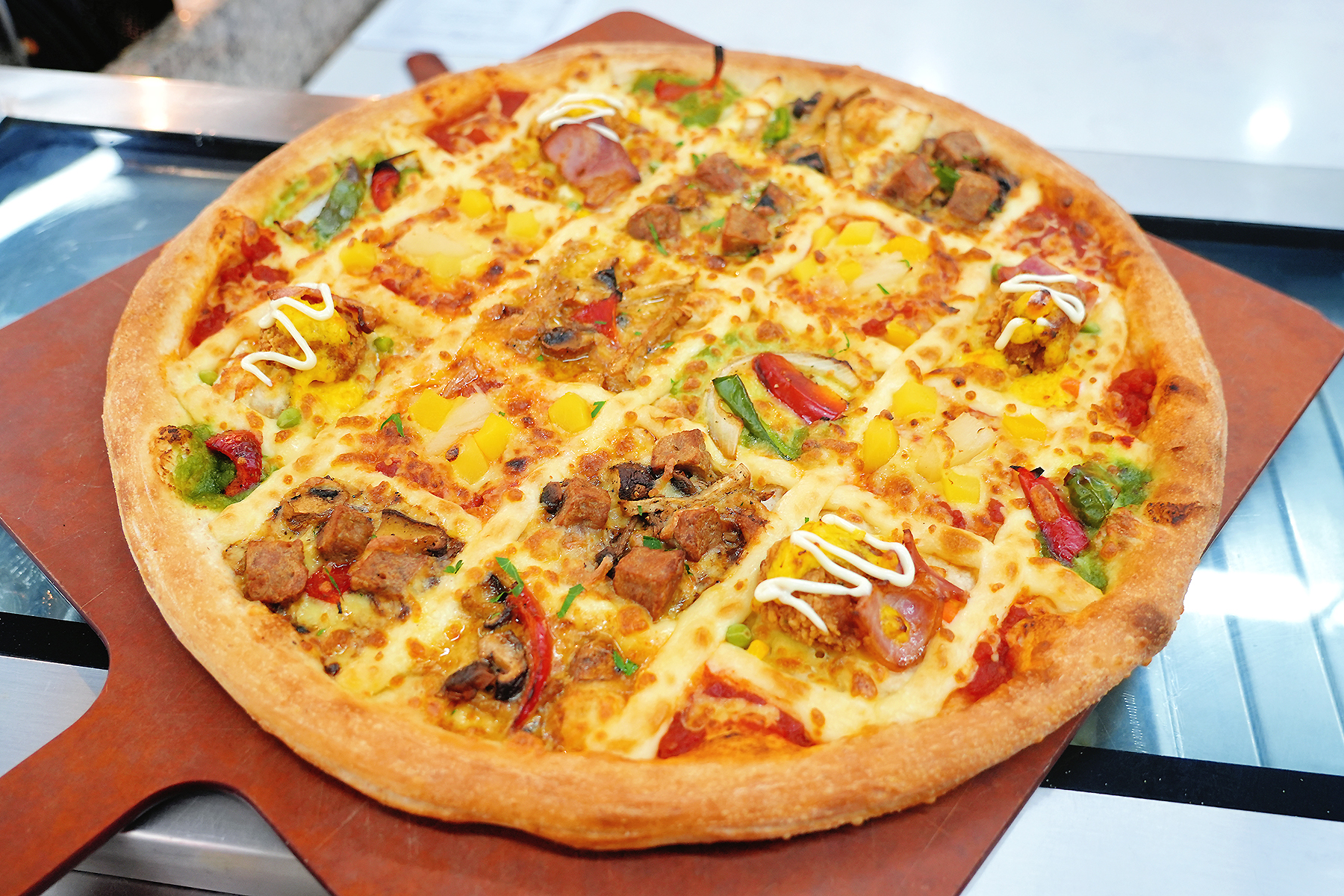 手工披萨在制作环节上可开放多元需求选项,让顾客获得个性化定做的专属参与感。如包边馅料选择(香肠、芝士棒、薯泥、芋泥、奶泥等)、顶料拼单(双拼、四拼、八拼等)、蘸酱配置(番茄酱、芝士酱等)等选项服务,无需额外成本即可落地,轻松贴合大众偏好。