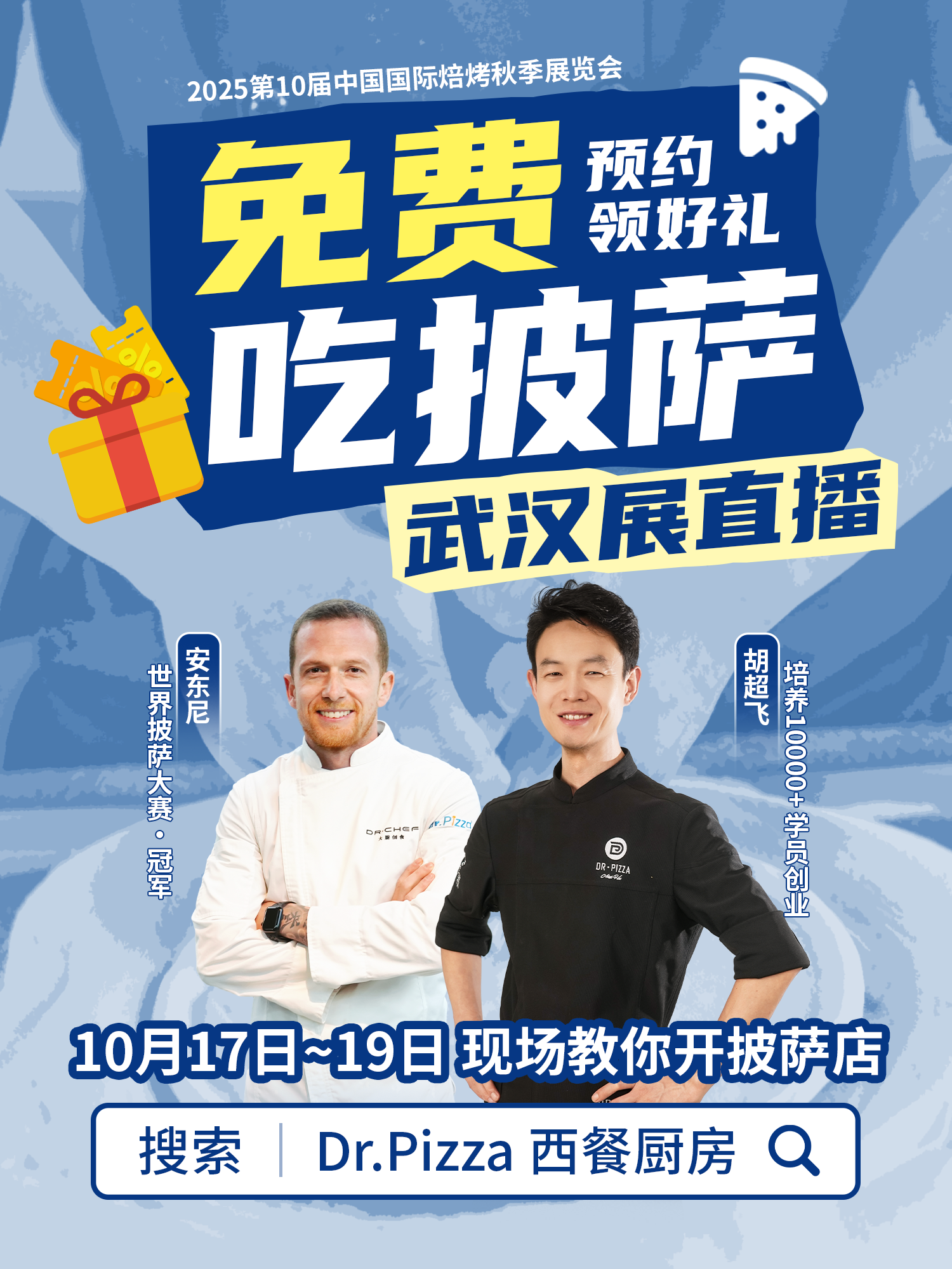 10月17-19日,齐聚武汉国际博览中心,共享秋日烘焙嘉年华!Dr.Pizza盼着能和大家在这场盛会里相遇,在这里,共享行业最新资讯,和新老朋友、业界同仁一起探讨行业方向、谋划未来发展!