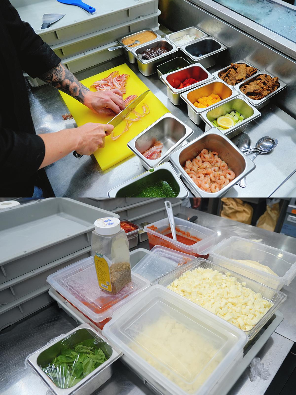 制备好的各式披萨馅料(比如蔬菜、肉类、奶酪等)需分门别类地存放于披萨撒料台,承载并区分这些馅料的容器即为分储盘。它能有效避免馅料混杂,保持工作台面整洁,加快披萨师撒料速度,同时助力实现出品标准化。