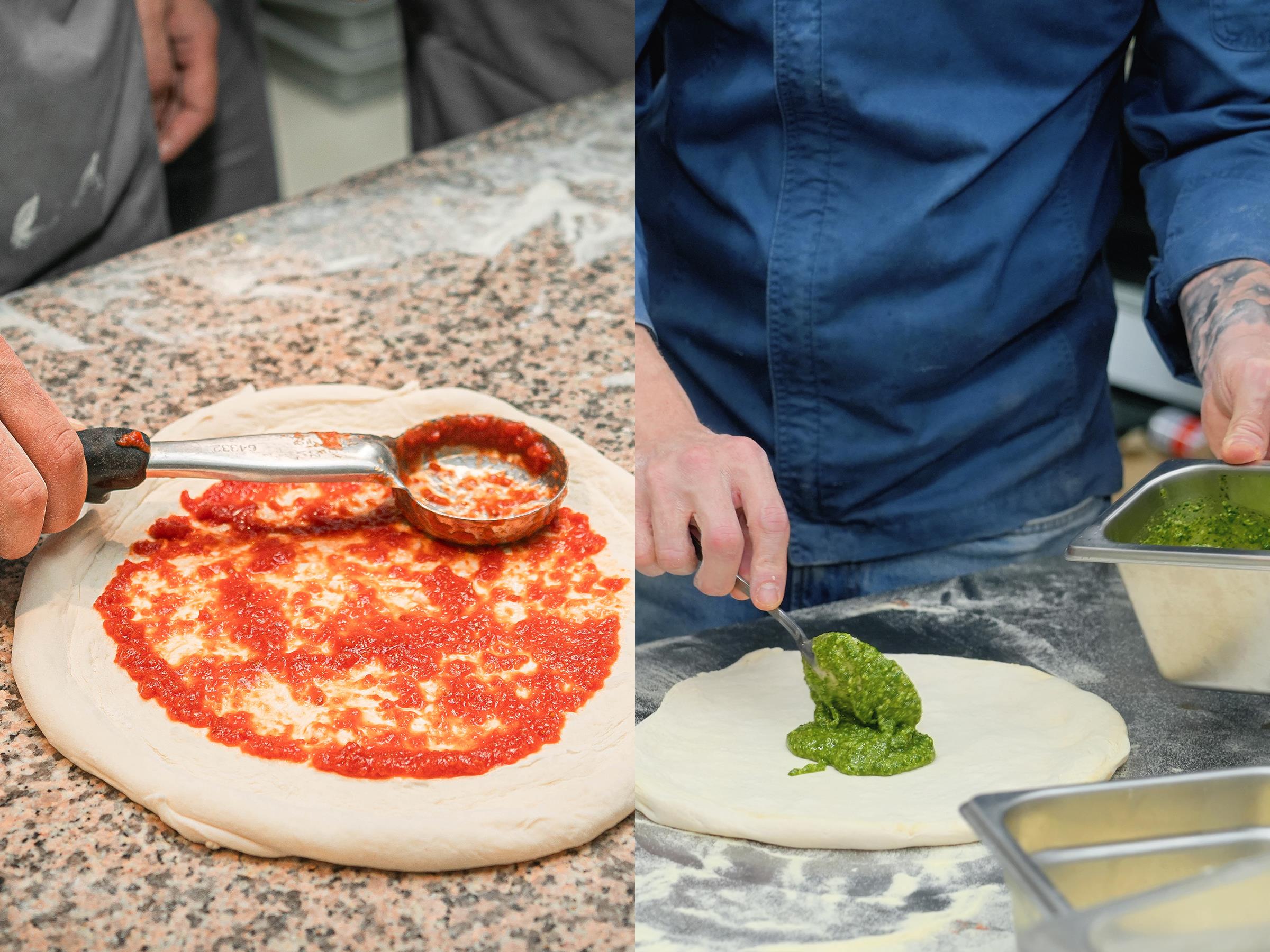 披萨店制作那坡里披萨取用酱汁时,可借助挤酱瓶、平底酱料勺或不锈钢勺,三者搭配使用可以覆盖大部分酱汁取用需求。