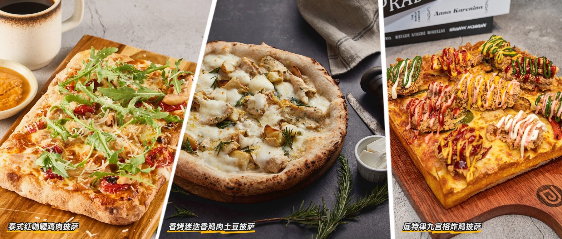 还有清香解腻的羽衣甘蓝酱、绵密开胃的酸甜芥辣酱、咸鲜浓稠的古早风味酱、菌香馥郁的黑松露酱、奶香浓郁的白酱、咸鲜带辛的黑椒汁等,每一款都能与鸡肉完美契合。巧用这些特色酱汁,让每一口都成为跨越风味疆域的惊喜之旅,让经典鸡肉披萨焕发百变魅力!