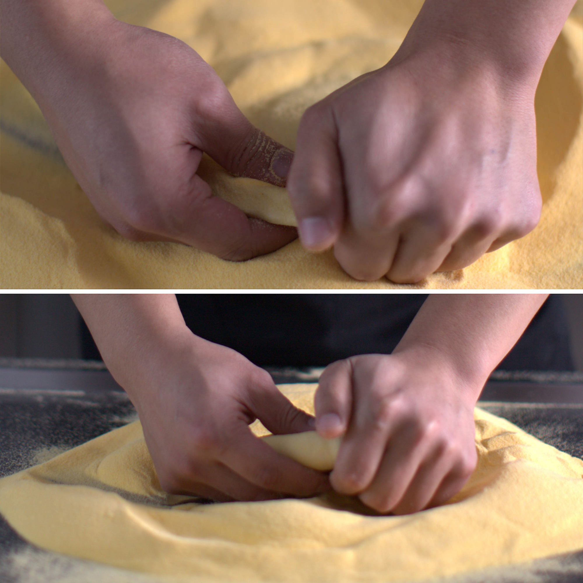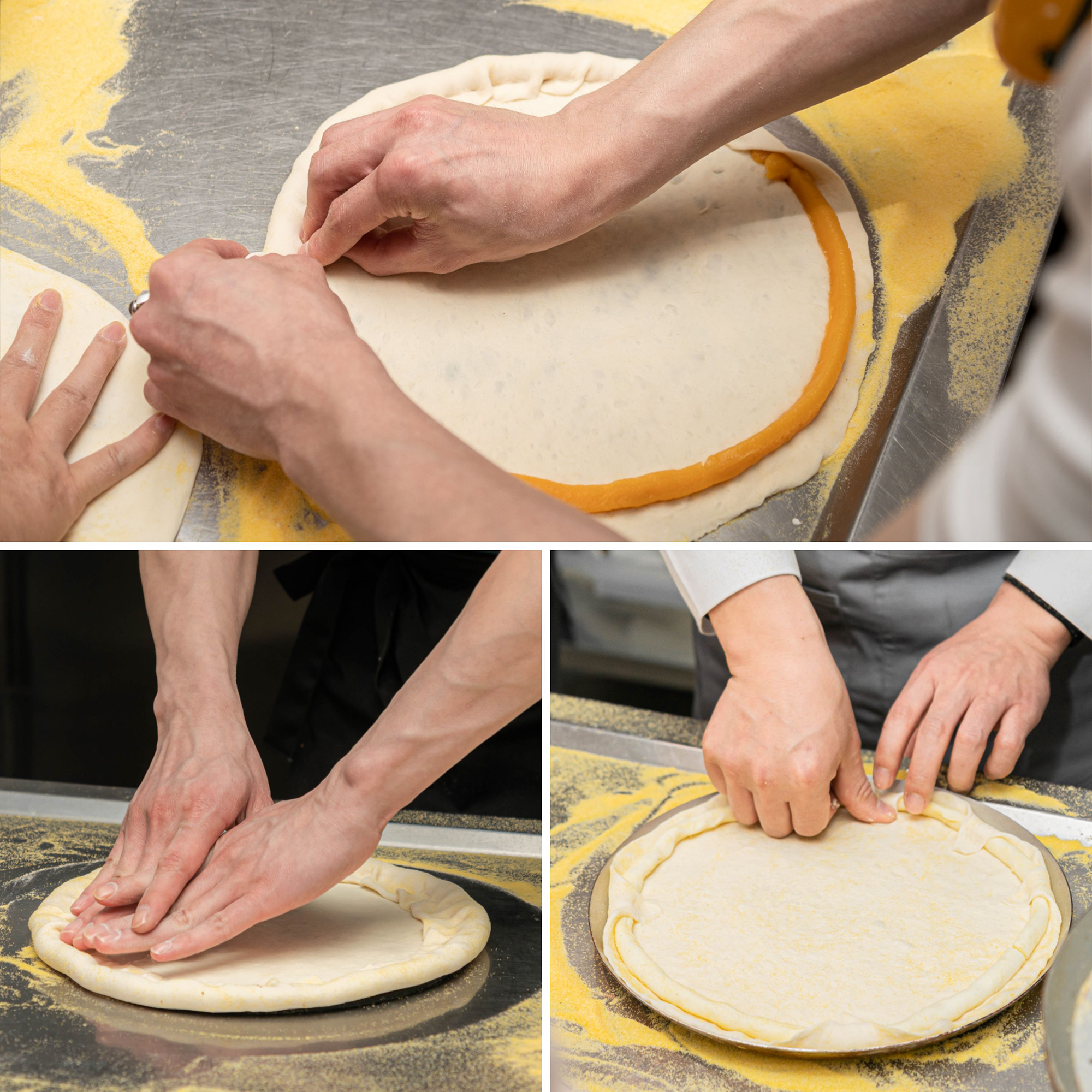 不同风格披萨在手工开皮成型阶段,都需要运用到捏制手法。纽约薄饼的饼边成型,除按压留边外,亦可直接虎口捏边成型;芝心披萨等特色饼底包边时,同样需提拉捏边塑形。