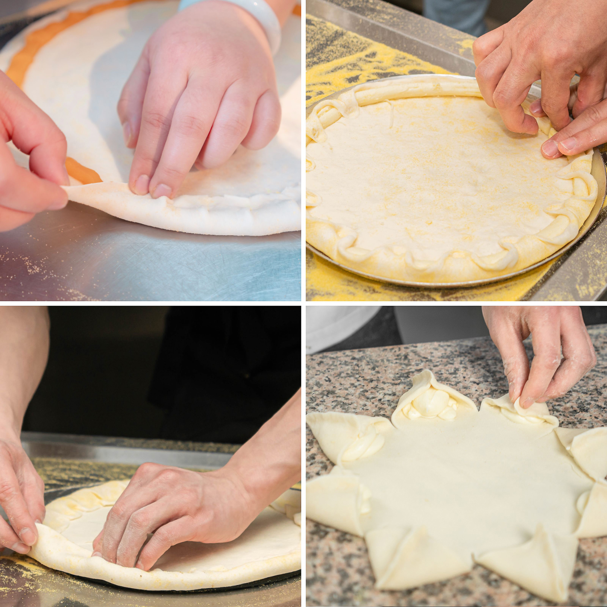 若要预留饼边,可左手托稳饼底,右手虎口捏住饼边,拇指在上,其余四指在下,边按压边旋转。操作过程中,饼底可置于操作台面或悬于空中。