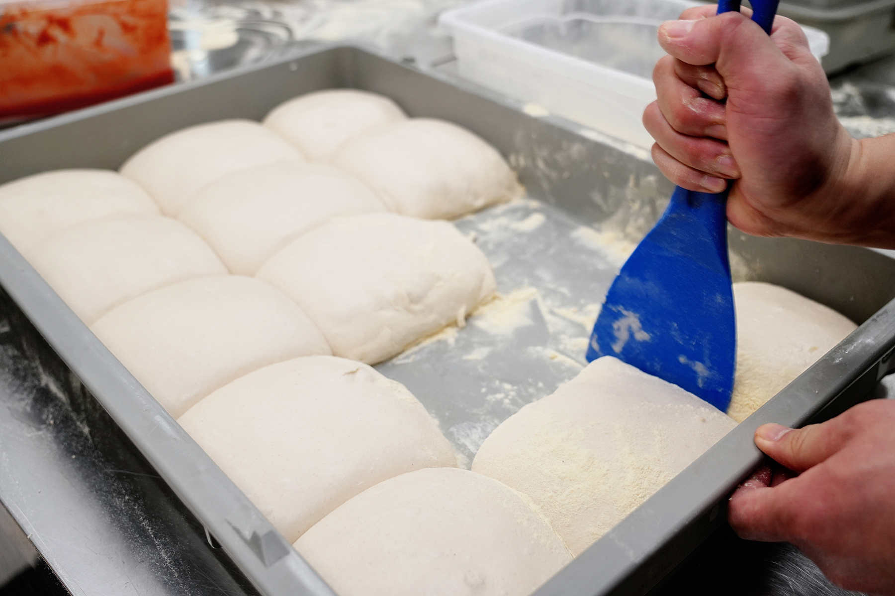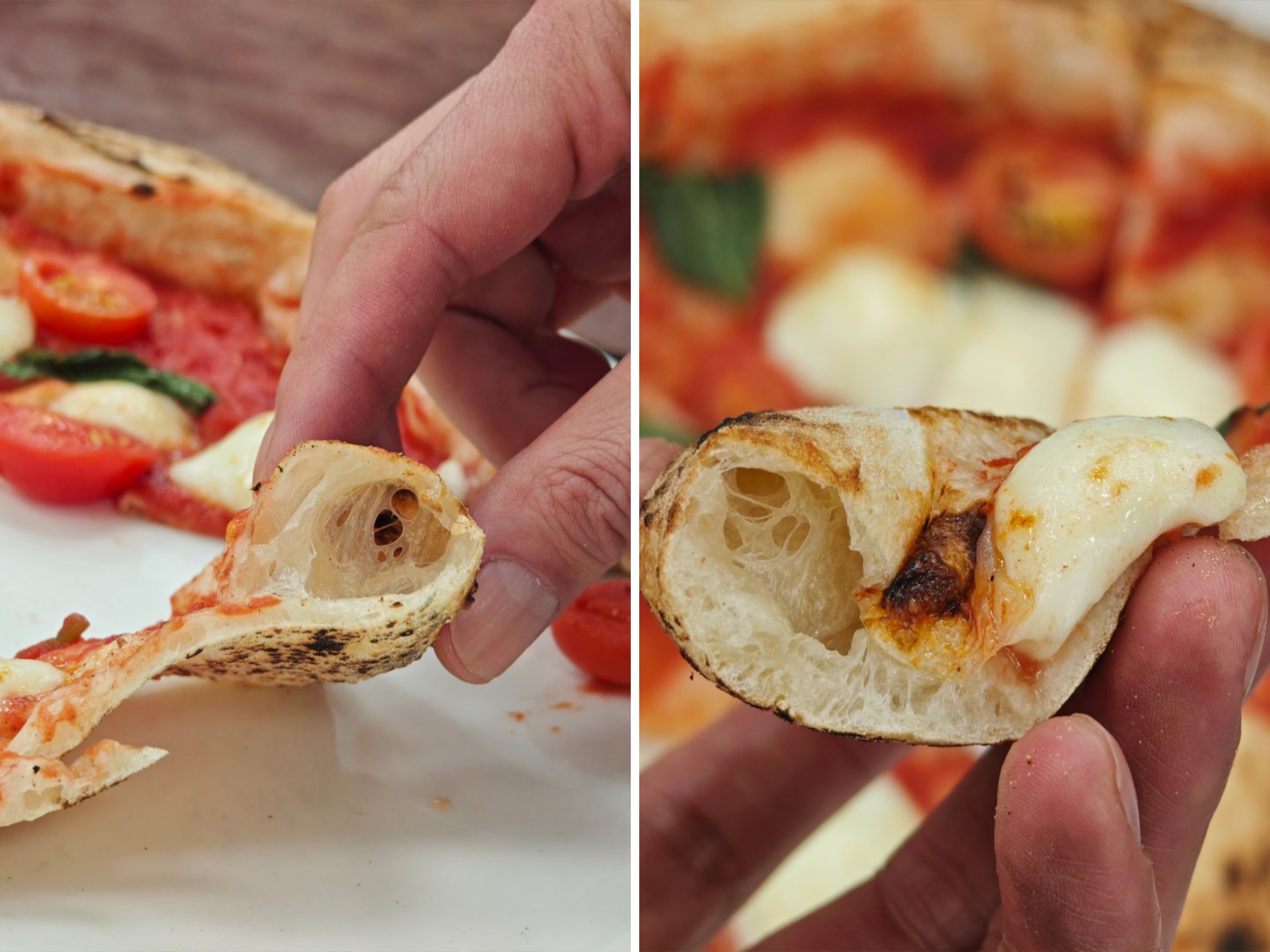 拿坡里开皮的核心是温柔伸展、保护气孔。开皮塑形的目的是将留存的气体推至边缘,以便形成蓬松轻盈的饼边、薄而均匀的饼底。开皮过程完全依靠手部动作,以完整保留面团天然的气孔结构。