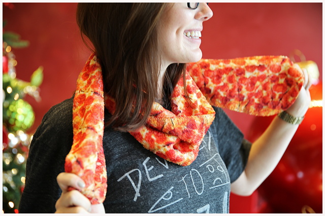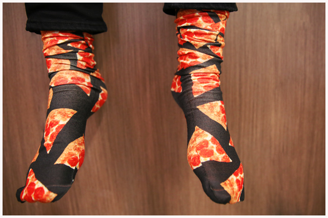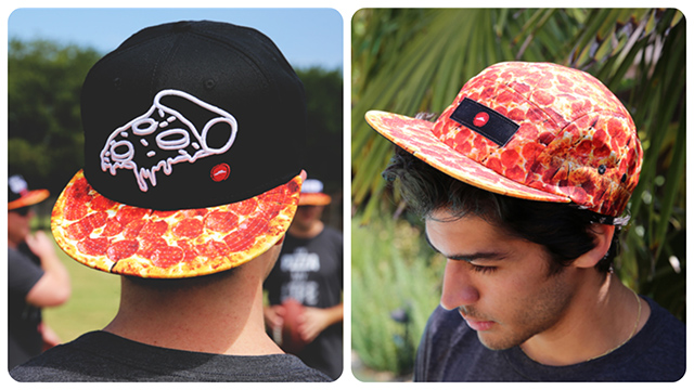 重要的是,所有单品都收纳进了满满的披萨元素。除了印着"PIZZA"字样的服饰与印着披萨、奶酪、水果、洋葱等简笔图案的枕套、被单稍显简约外,印满彩色披萨的滑板、帽檐看起来就像一块火腿披萨的帽子还有可以说是难以直视的披萨围巾等,都制作得十分逼真。