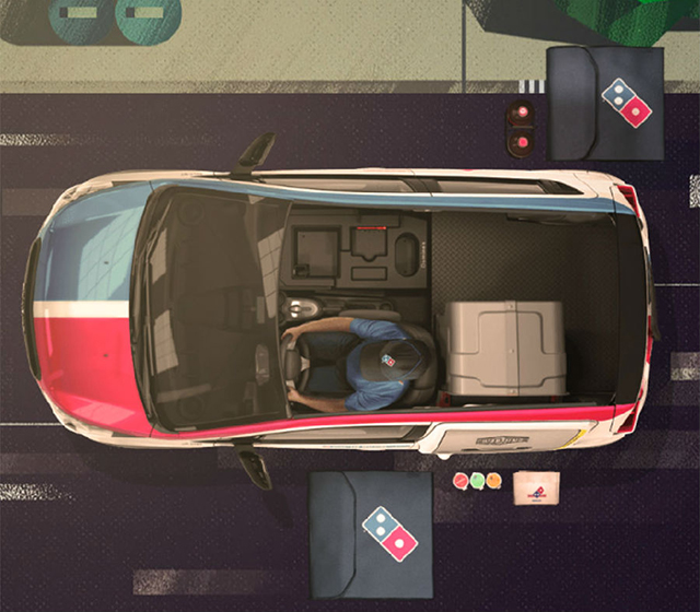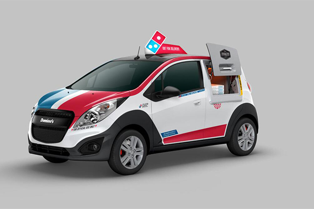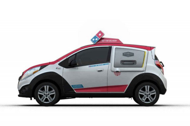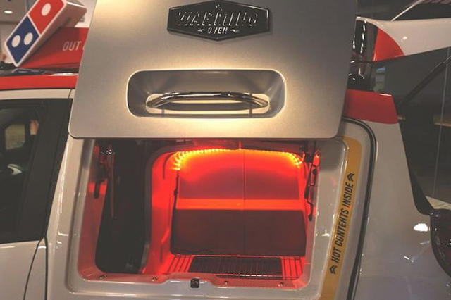 达美乐购买了100辆雪佛兰ChevySpark汽车,经过深度改装设计,将车设内部的座椅只设一个作为,其余空间均留给披萨,打造了一个超大体积的140°恒温烤箱,实现边送边烤的愿望,让顾客拿到刚刚出炉的美味披萨。此外车内还有放置纸巾、酱料、大瓶汽水等外卖必需品的空间。