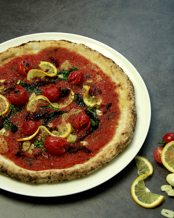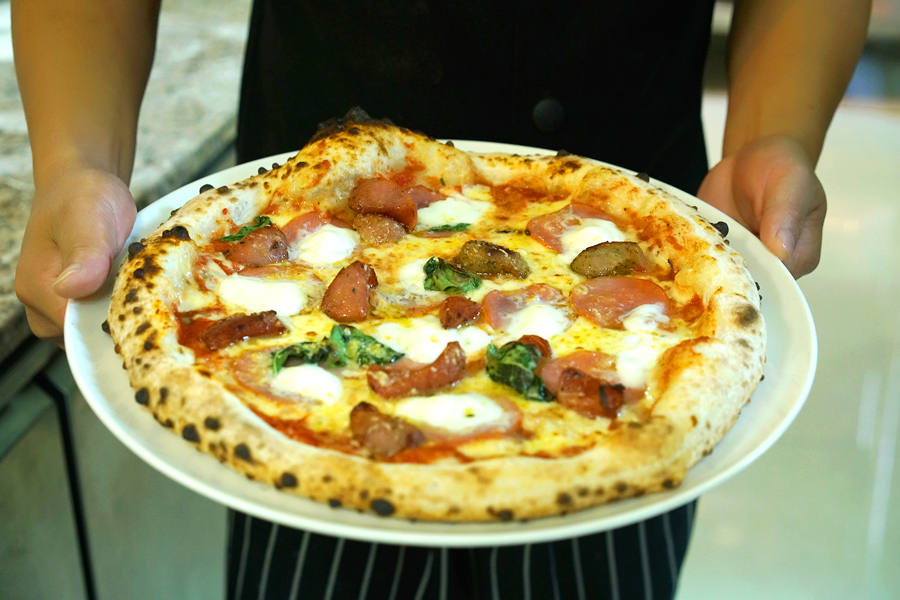 传统窑炉烘烤拿坡里披萨,可以在较短的时间内让整个披萨均匀受热,饼边快速隆起、焦化,面饼和馅料的水分被快速锁住,从而使得披萨松软柔韧,且汁水丰富。