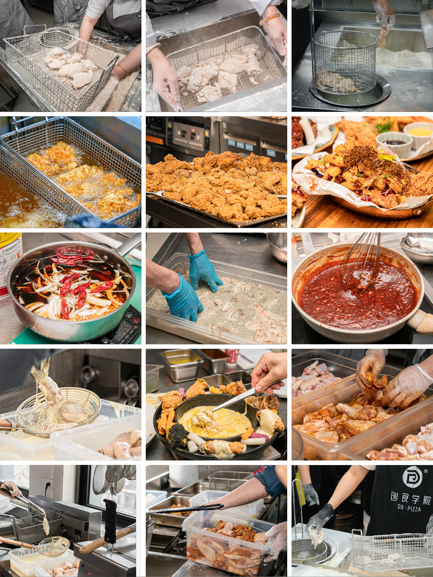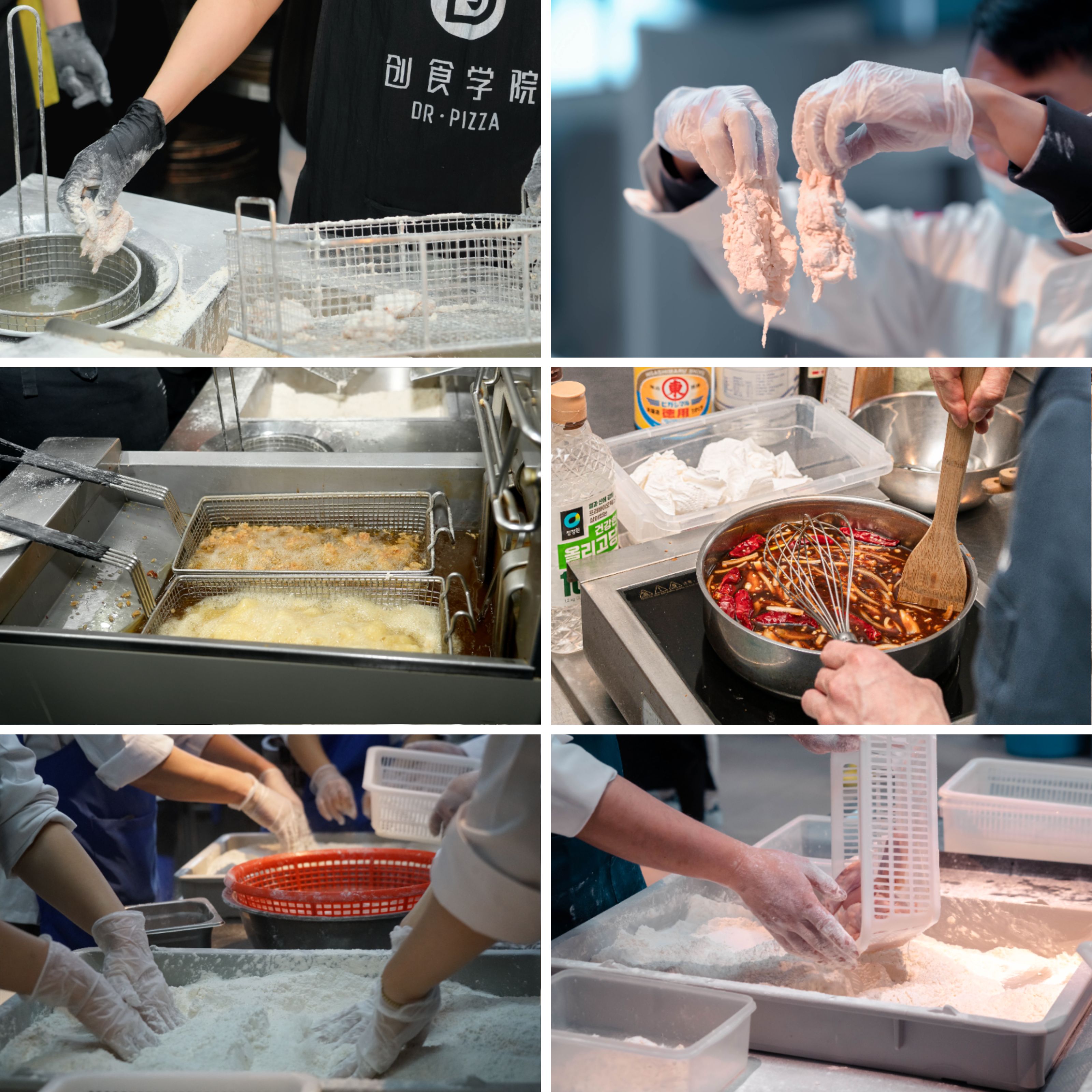 上午:不同部位鸡肉处理工艺、无血去腥腌制技术;原创酱料&经典韩式酱料制作、裹浆炸鸡技术系统教学;