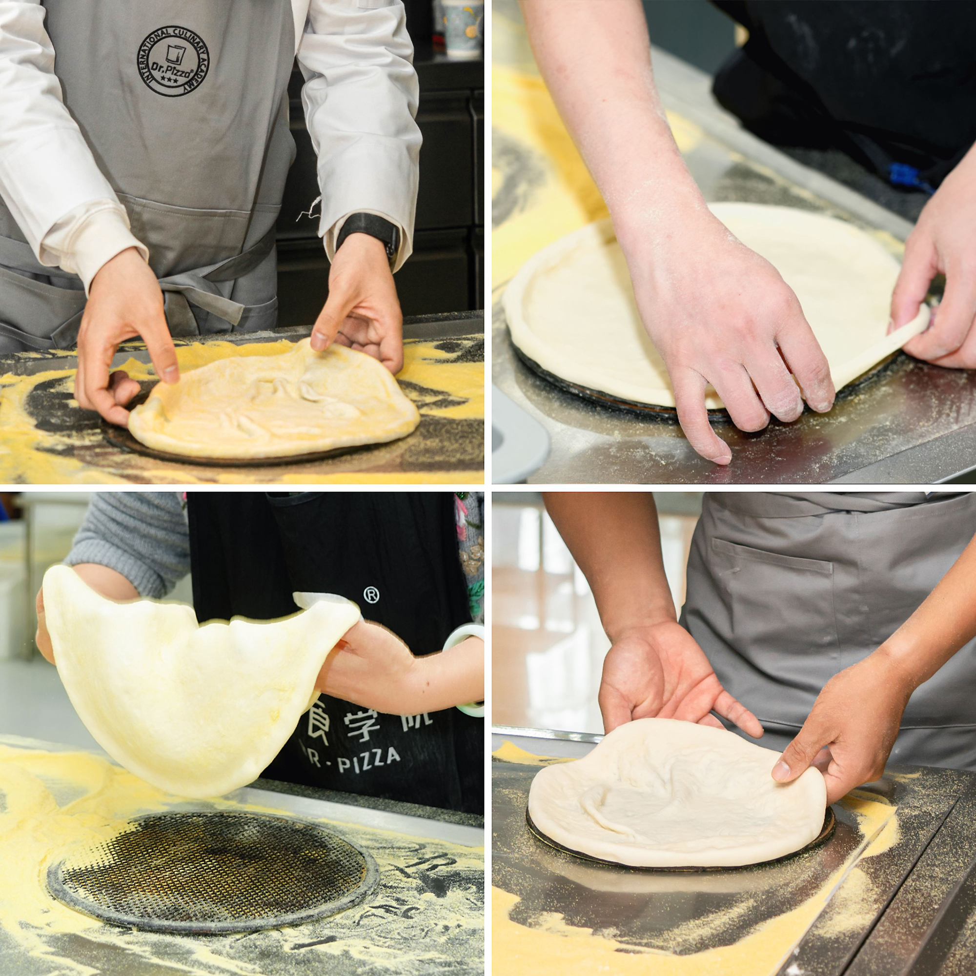 特别提示:为确保饼皮完整性,各位小伙伴们在练习开皮前,请记得先修剪指甲。此外,制作手工披萨时,为提升出品效率,需将多个手法交替搭配使用,一名合格的职业披萨师应熟练应用多种开皮技法手法。