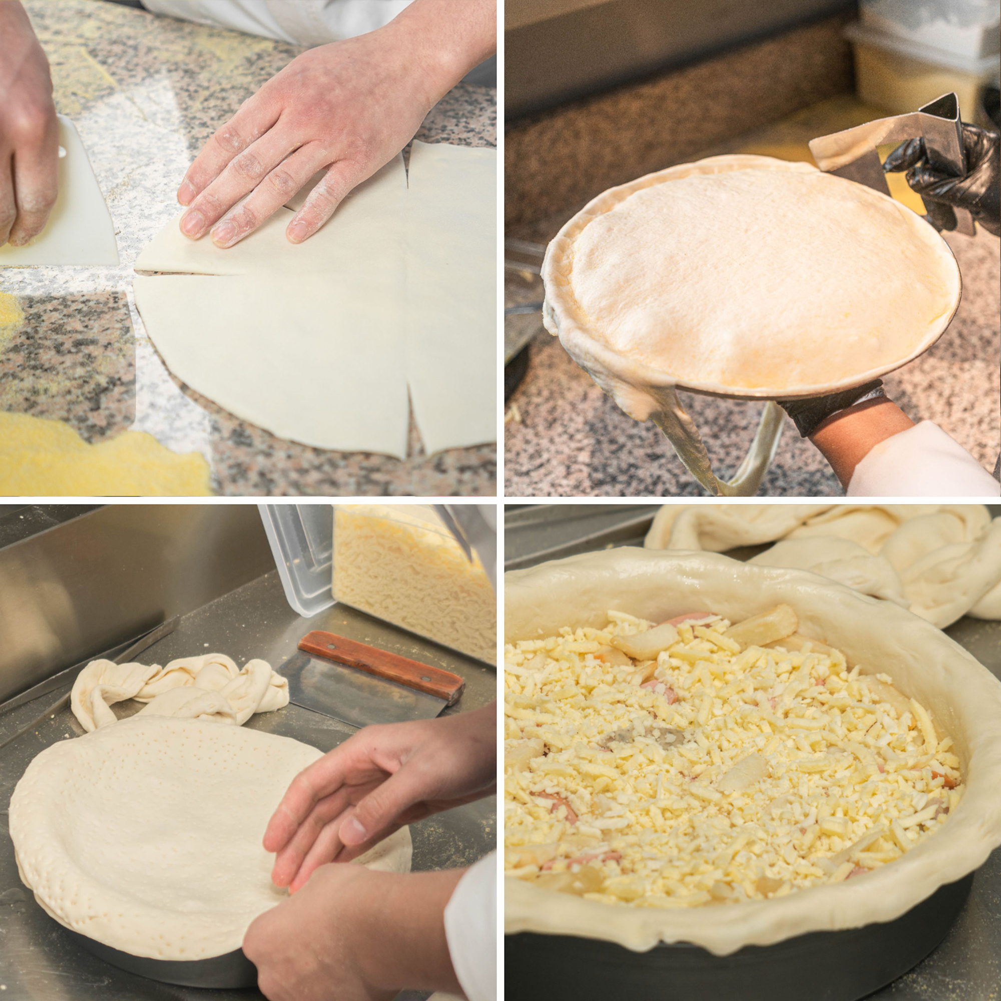 已开皮成型的披萨饼底,可通过工具剪切来调整饼皮形态,以塑造出不同形态的花式披萨饼底。比如双层披萨、芝加哥深盘、爱心披萨、花环披萨、八角星披萨、圣诞树披萨等。