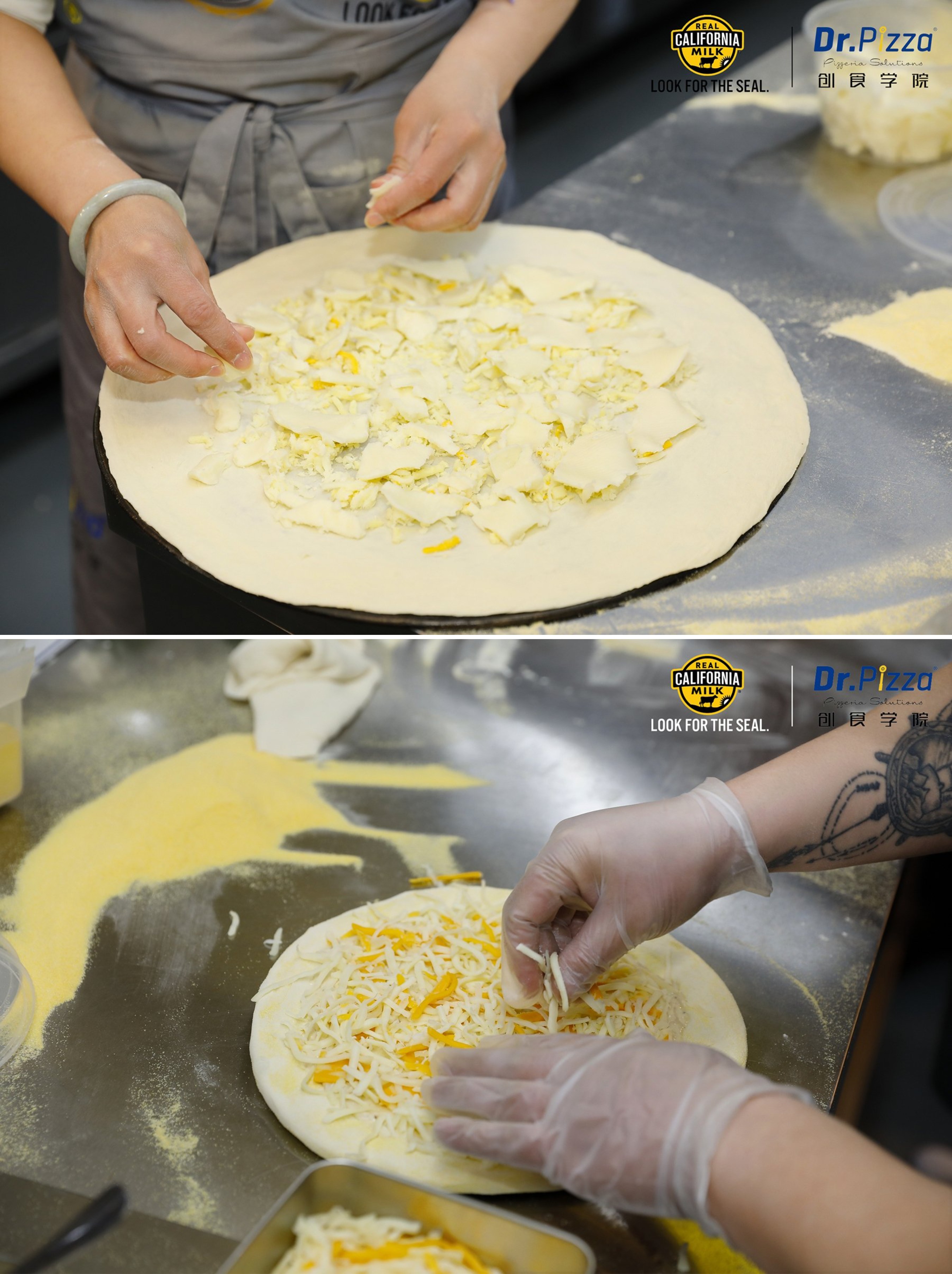 采用底芝士(铺于底酱之上)和顶芝士(撒在所有配料表面)二者相结合的应用方式,能有效打造结构完美、层次丰富、视觉吸睛的美味披萨。